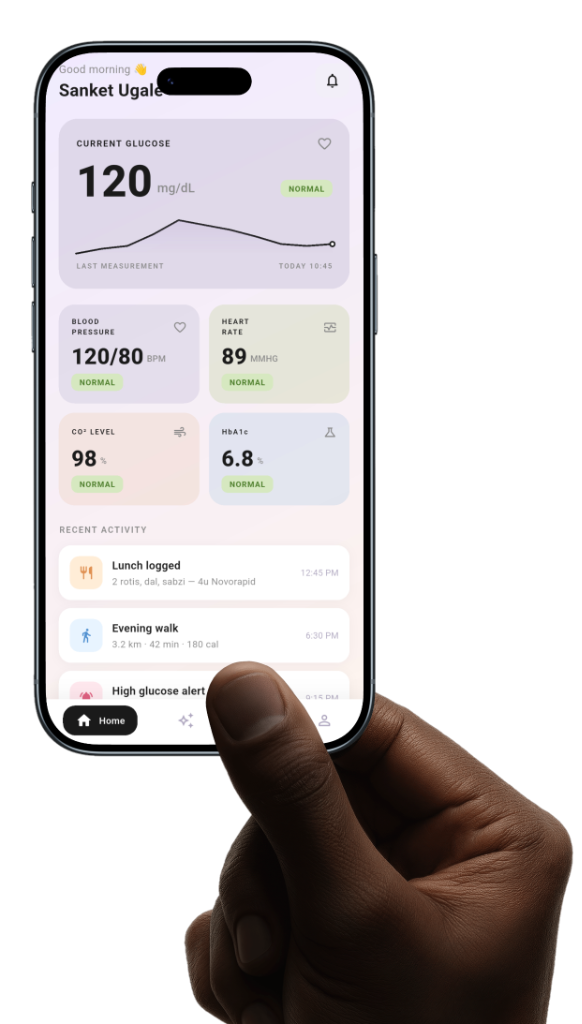 Simply type or speak naturally: "Had 2 rotis for lunch, took 4 units Novorapid, walked 3 km after dinner." Our AI (powered by AWS Bedrock) parses the text, logs each treatment entry correctly, and over time learns your patterns to provide weekly insights.